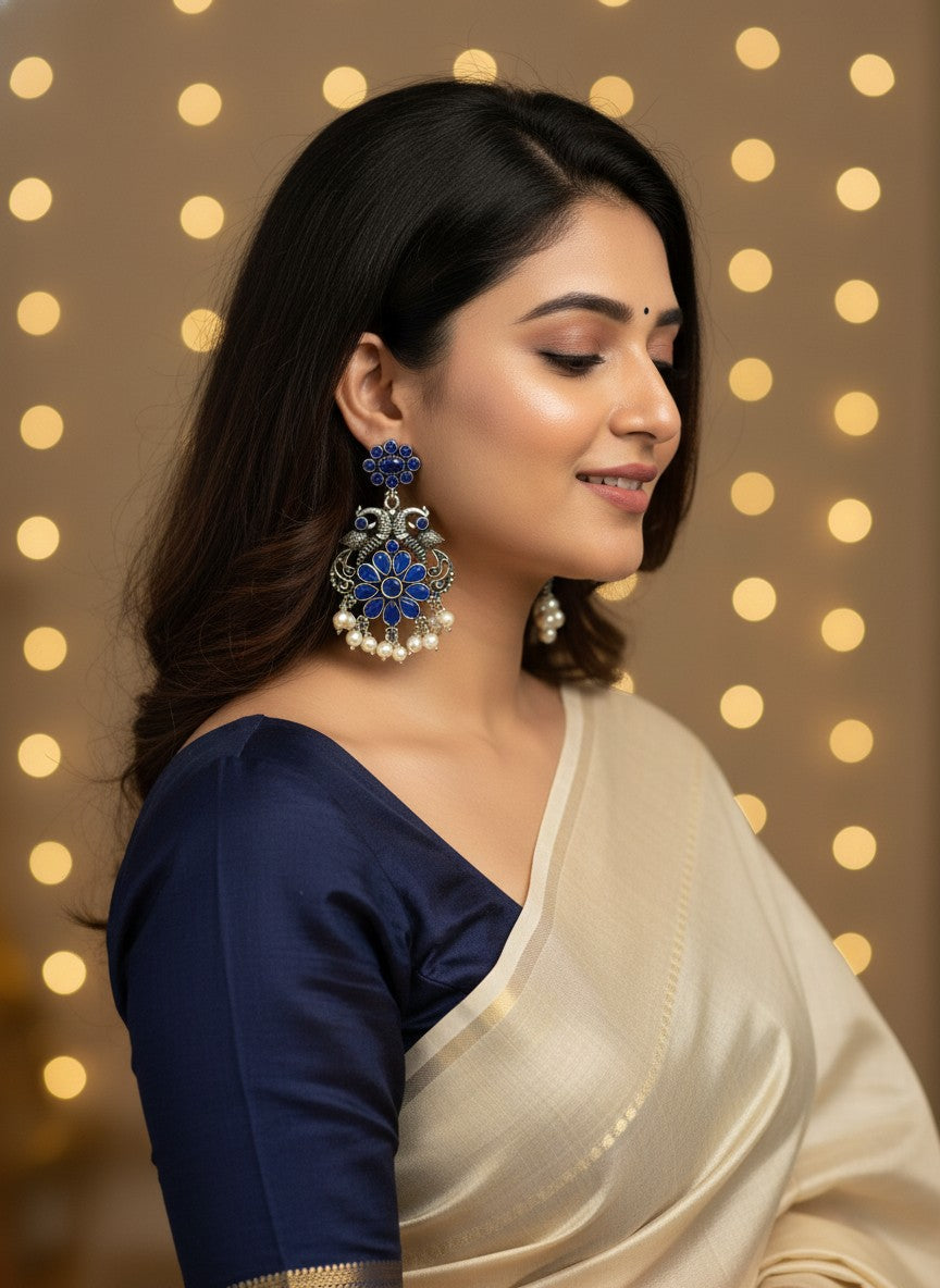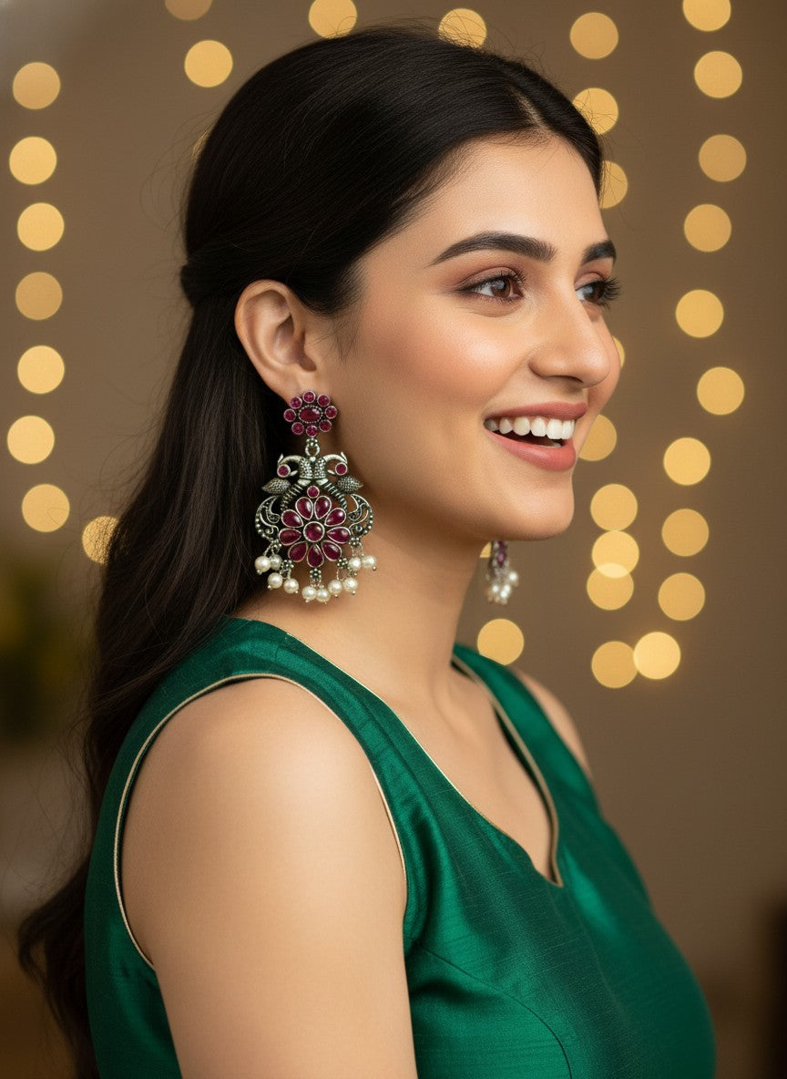 Silver Oxidized Peacock Dangler Earrings with Stone and Pearls