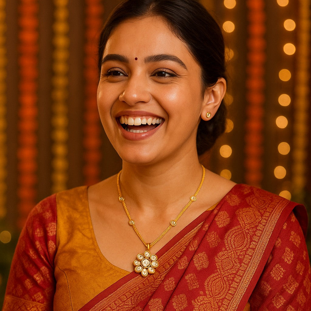 Turn heads and steal hearts with this gorgeous Traditional Gold Kundan Necklace—a flawless blend of heritage glamour and modern allure. The delicate flower pendant dances with every movement, while the coordinating studs add just the right touch of sparkle. Kundan's legendary craftsmanship ensures you'll feel like royalty, whether you're dressing up for a night out or adding a dash of magic to your everyday. Because sometimes, a little golden shimmer is all you need to feel absolutely irresistible.