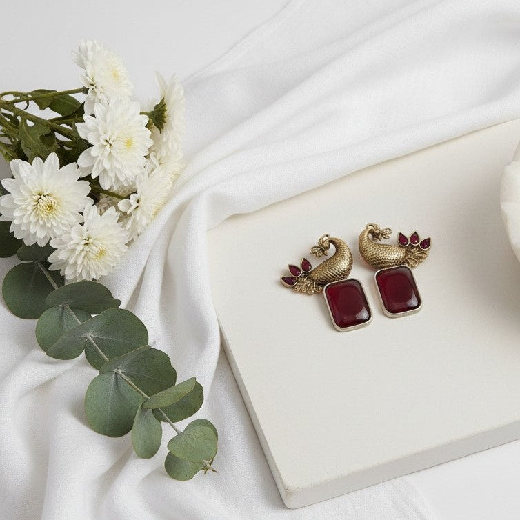 Peacock-inspired elegance meets timeless tradition in these captivating two-tone earrings. Intricate ethnic stonework adorns each design, blending rich metallic tones with vibrant gemstone details that catch the light beautifully. Perfect for adding a touch of heritage glamour to any occasion, these statement pieces celebrate the artistry of classic jewelry craftsmanship. Wear them to elevate your everyday style or make them your go-to for celebrations.