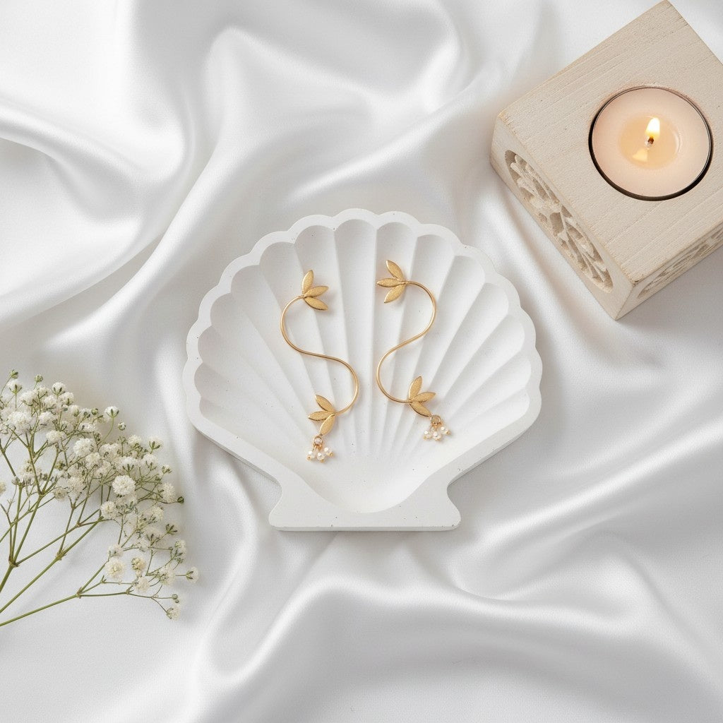 Handmade Gold Plated Leaf Style Earring with Pearl detailing for Women