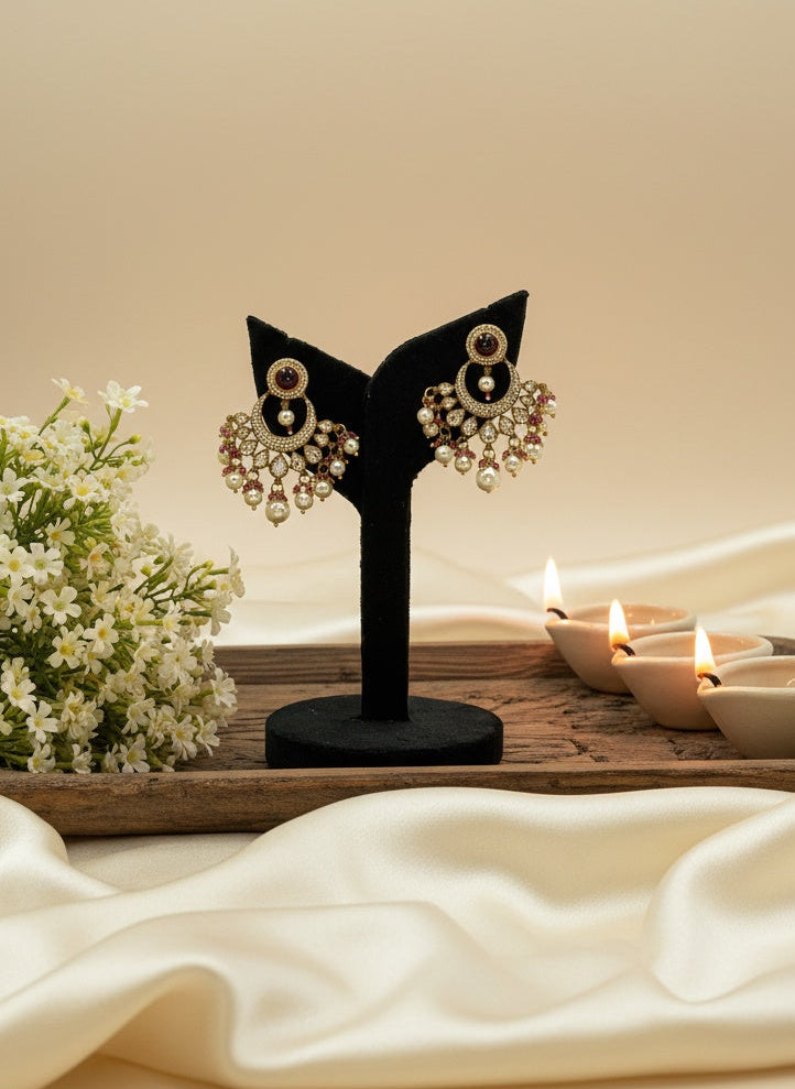 This Victorian-era inspired dangler showcases authentic Polki stone setting—a traditional lapidary technique featuring Kundan stones—complemented by pearl embellishments. The gold plating provides durability and lustrous finish while maintaining the intricate craftsmanship characteristic of heritage jewelry design. Ideal for connoisseurs seeking pieces that balance historical aesthetics with contemporary wearability.